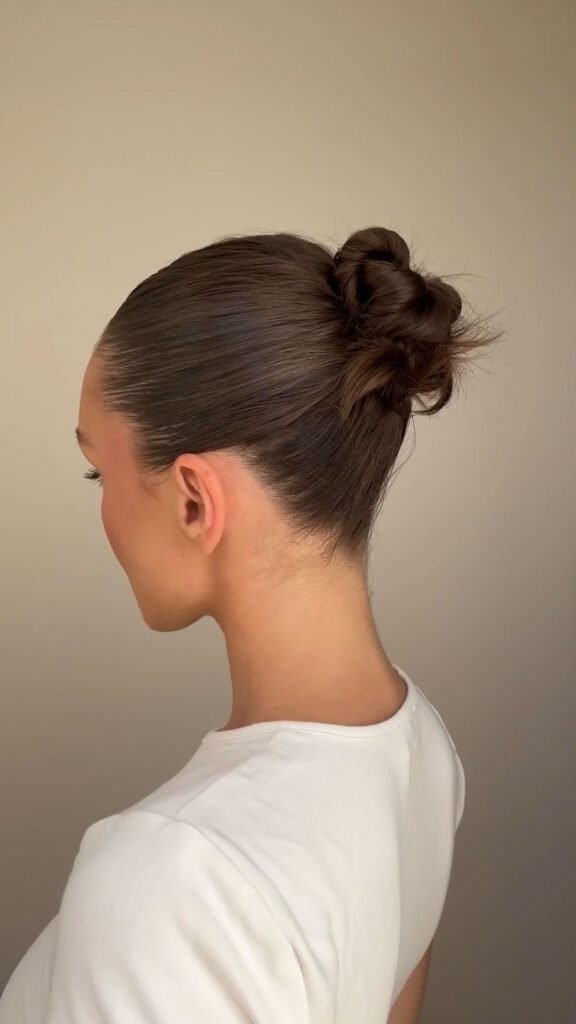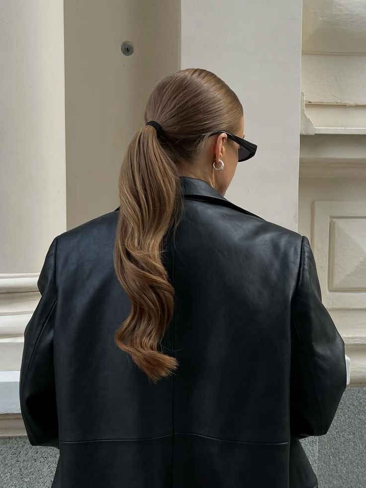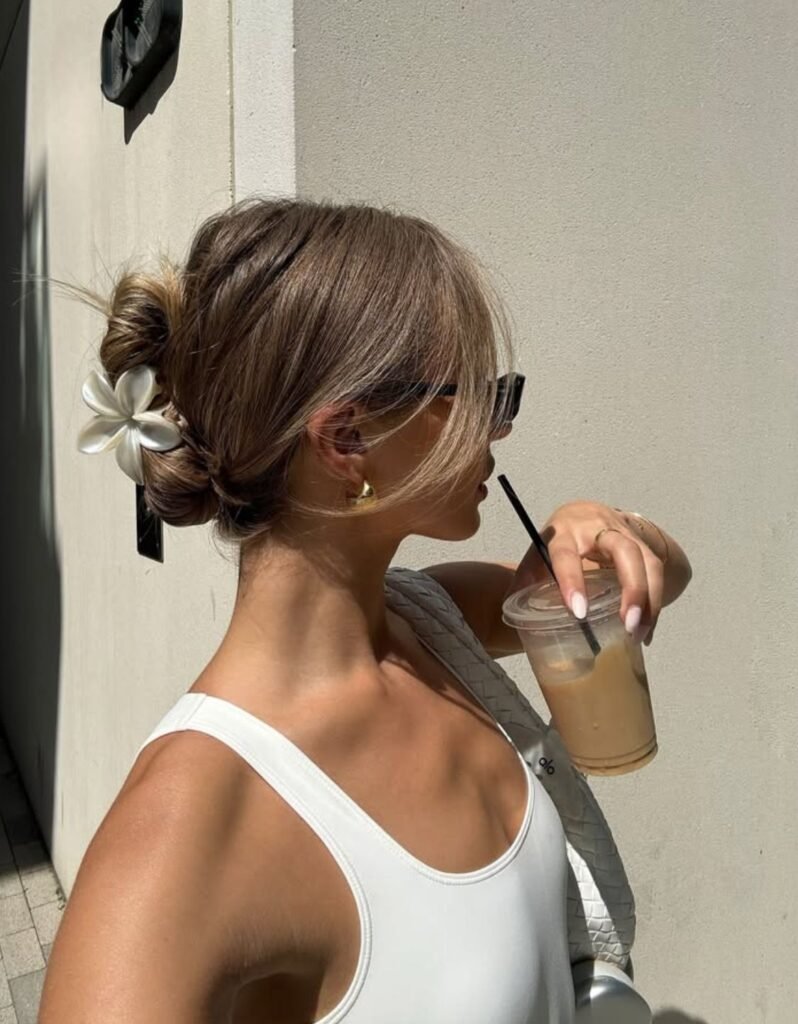 A low bun or ponytail is chic and timeless. Use a smoothing hair gel or oil to keep flyaways in place and give that polished finish. Bonus: it pairs perfectly with gold hoops and sunglasses!