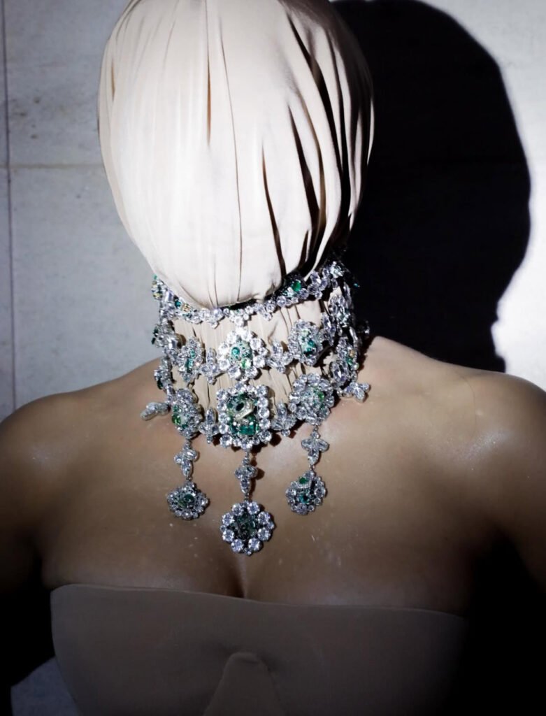 While the gown itself embodied restraint, Kim balanced it with a spectacular Margiela jewelry statement — a crystal-embellished choker layered with dazzling gemstones.
