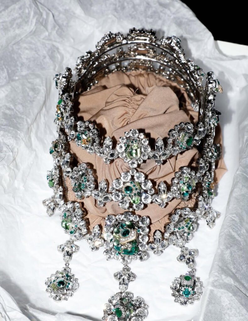 The necklace is made up of large, silver-colored crystal motifs, each set with striking green emeralds. It was also accompanied by sparkling emerald rings, which added a rich pop of color and a touch of old-world glamour to this futuristic ensemble. The contrast between the minimal fabric and maximal accessories was pure Galliano drama: opulent, surreal, and unforgettable.