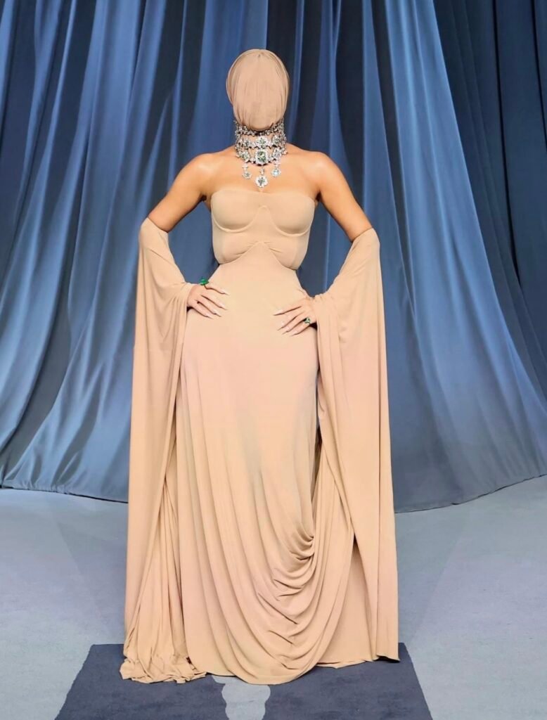 Kim Kardashian arrived in a form-fitting, draped nude gown that flowed effortlessly from her sculpted corset down to the floor. The design, a true example of Galliano’s couture genius, combined classic draping with a modern, surrealist twist. Long, cape-like sleeves framed her figure, giving the impression of movement and power even when she stood still.